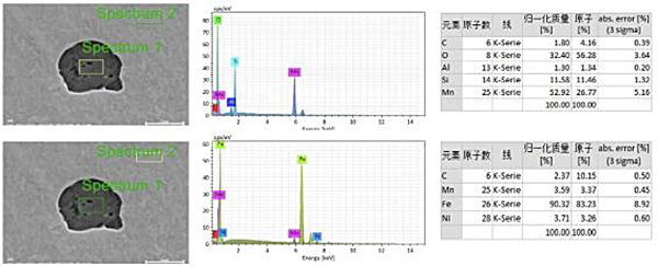 將電子束固定在試樣感興趣的點上,進行定性或定量分析??蓪Σ牧暇Ы?、夾雜、析出相、沉淀物、及材料的組成等分析。特征 X 射線譜線強度與相關元素含量和化學成分有關;此外,相互作用時會產生一定的深度和側向擴展(μm數量級),因此EDS接受的X射線來自電子束轟擊點下幾個μm量級的范圍,超過了選定的區(qū)域,因而所獲得的結果是該體積內的某種平均值。