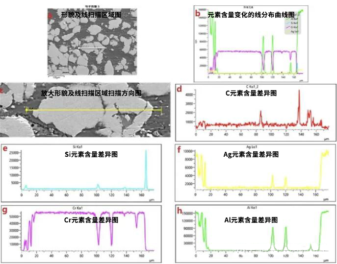 電子束沿著一條分析線進行掃描時,可以獲得元素含量變化的線分布曲線。通過與試樣形貌相結合分析,可以直觀地獲取元素在不同相或區(qū)域內的分布情況。